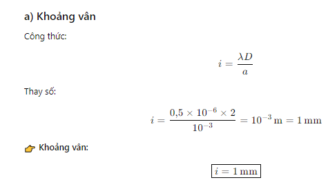 - a) Khoảng vân \(\Delta x = 1 \text{ mm}\)