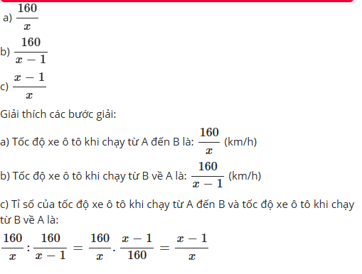 c) Tỉ số vận tốc của xe ô tô khi chạy từ A đến B và vận tốc của xe ô tô khi chạy từ B về A là $\frac{\frac{160}{x}}{\frac{160}{x-1}}=\frac{x-1}{x}$