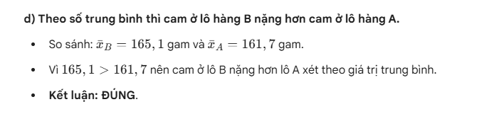 d) Sai vì theo số trung bình thì cam ở lô hàng B nhẹ hơn cam ở lô hàng A.