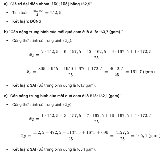 c) Sai vì cân nặng trung bình của mỗi quả cam ở lô B là: