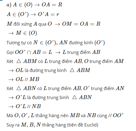 - Do M là điểm đối xứng của A qua O và N là điểm đối xứng của A qua $O^\prime$, nên M, A, N thẳng hàng.