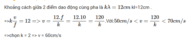 - Với \( k=4 \Rightarrow \lambda = \frac{2d}{4} = \frac{24}{4} = 6 \, \text{cm} \Rightarrow v = 10 \times 0,06 = 0,6 \, \text{m/s} = 60 \, \text{cm/s} \) (thuộc khoảng 50-70 cm/s)