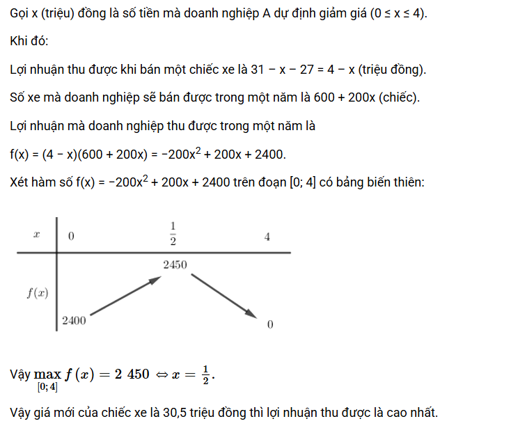 Để giải quyết bài toán này, chúng ta cần xác định giá bán mới sao cho lợi nhuận của doanh nghiệp đạt mức tối đa. Chúng ta sẽ sử dụng kiến thức về đạo hàm để tìm điểm cực đại của hàm lợi nhuận.