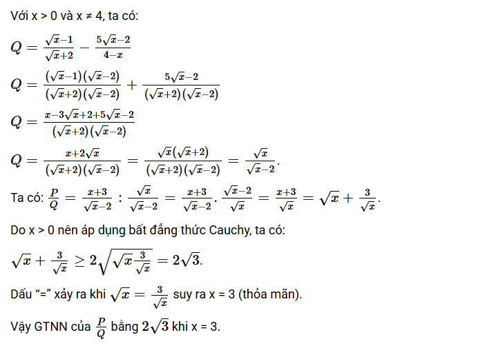 Bài 05: 1) \(3\sqrt{2} - 4\sqrt{18} + 2\sqrt{32} - \sqrt{50}\) Ta sẽ rút gọn từng hạng tử: \[ \begin{align} 3\sqrt{2} &= 3\sqrt{2}, \\ -4\sqrt{18} &= -4 \cdot \sqrt{9 \cdot 2} = -4 \cdot 3\sqrt{2} = -12\sqrt{2}, \\ 2\sqrt{32} &= 2 \cdot \sqrt{16 \cdot 2} = 2 \cdot 4\sqrt{2} = 8\sqrt{2}, \\ -\sqrt{50} &= -\sqrt{25 \cdot 2} = -5\sqrt{2}. \end{align} \] Tổng hợp lại: \[ 3\sqrt{2} - 12\sqrt{2} + 8\sqrt{2} - 5\sqrt{2} = (3 - 12 + 8 - 5)\sqrt{2} = -6\sqrt{2}. \] Đáp án: \(-6\sqrt{2}\). 2) \((2\sqrt{24} - 2\sqrt{54}) : \sqrt{6} + 3\sqrt{6} - \sqrt{150}\) Ta sẽ rút gọn từng hạng tử: \[ \begin{align} 2\sqrt{24} &= 2 \cdot \sqrt{4 \cdot 6} = 2 \cdot 2\sqrt{6} = 4\sqrt{6}, \\ -2\sqrt{54} &= -2 \cdot \sqrt{9 \cdot 6} = -2 \cdot 3\sqrt{6} = -6\sqrt{6}. \end{align} \] Tổng hợp lại: \[ (4\sqrt{6} - 6\sqrt{6}) : \sqrt{6} + 3\sqrt{6} - \sqrt{150} = (-2\sqrt{6}) : \sqrt{6} + 3\sqrt{6} - \sqrt{150} = -2 + 3\sqrt{6} - \sqrt{150}. \] Rút gọn tiếp: \[ -2 + 3\sqrt{6} - \sqrt{150} = -2 + 3\sqrt{6} - \sqrt{25 \cdot 6} = -2 + 3\sqrt{6} - 5\sqrt{6} = -2 - 2\sqrt{6}. \] Đáp án: \(-2 - 2\sqrt{6}\). 3) \((2\sqrt{\frac{16}{3}} - 3\sqrt{\frac{1}{27}} - 6\sqrt{\frac{4}{75}}) \cdot \sqrt{3}\) Ta sẽ rút gọn từng hạng tử: \[ \begin{align} 2\sqrt{\frac{16}{3}} &= 2 \cdot \sqrt{\frac{16}{3}} = 2 \cdot \frac{4}{\sqrt{3}} = \frac{8}{\sqrt{3}}, \\ -3\sqrt{\frac{1}{27}} &= -3 \cdot \sqrt{\frac{1}{27}} = -3 \cdot \frac{1}{3\sqrt{3}} = -\frac{1}{\sqrt{3}}, \\ -6\sqrt{\frac{4}{75}} &= -6 \cdot \sqrt{\frac{4}{75}} = -6 \cdot \frac{2}{5\sqrt{3}} = -\frac{12}{5\sqrt{3}}. \end{align} \] Tổng hợp lại: \[ \left(\frac{8}{\sqrt{3}} - \frac{1}{\sqrt{3}} - \frac{12}{5\sqrt{3}}\right) \cdot \sqrt{3} = \left(\frac{8 - 1 - \frac{12}{5}}{\sqrt{3}}\right) \cdot \sqrt{3} = \left(\frac{7 - \frac{12}{5}}{\sqrt{3}}\right) \cdot \sqrt{3} = \left(\frac{\frac{35 - 12}{5}}{\sqrt{3}}\right) \cdot \sqrt{3} = \left(\frac{\frac{23}{5}}{\sqrt{3}}\right) \cdot \sqrt{3} = \frac{23}{5}. \] Đáp án: \(\frac{23}{5}\). 4) \(\frac{3 + 2\sqrt{3}}{\sqrt{3}} + \frac{2 + \sqrt{2}}{\sqrt{2} + 1} - (2 + \sqrt{3})\) Ta sẽ rút gọn từng hạng tử: \[ \begin{align} \frac{3 + 2\sqrt{3}}{\sqrt{3}} &= \frac{3}{\sqrt{3}} + \frac{2\sqrt{3}}{\sqrt{3}} = \sqrt{3} + 2, \\ \frac{2 + \sqrt{2}}{\sqrt{2} + 1} &= \frac{(2 + \sqrt{2})(\sqrt{2} - 1)}{(\sqrt{2} + 1)(\sqrt{2} - 1)} = \frac{2\sqrt{2} - 2 + 2 - \sqrt{2}}{2 - 1} = \frac{\sqrt{2}}{1} = \sqrt{2}. \end{align} \] Tổng hợp lại: \[ \sqrt{3} + 2 + \sqrt{2} - (2 + \sqrt{3}) = \sqrt{3} + 2 + \sqrt{2} - 2 - \sqrt{3} = \sqrt{2}. \] Đáp án: \(\sqrt{2}\). Bài 06: a) Với \( x = 16 \): \[ A = \frac{4}{\sqrt{16} + 2} = \frac{4}{4 + 2} = \frac{4}{6} = \frac{2}{3} \] b) Ta có: \[ B = \frac{3}{\sqrt{x} + 2} - \frac{\sqrt{x}}{\sqrt{x} - 2} + \frac{2x - 5\sqrt{x} + 10}{x - 4} \] Ta sẽ biến đổi từng phần: \[ \frac{2x - 5\sqrt{x} + 10}{x - 4} = \frac{2(\sqrt{x})^2 - 5\sqrt{x} + 10}{(\sqrt{x} - 2)(\sqrt{x} + 2)} = \frac{2(\sqrt{x} - 2)(\sqrt{x} + 2) - 5\sqrt{x} + 10}{(\sqrt{x} - 2)(\sqrt{x} + 2)} \] \[ = \frac{2(\sqrt{x} - 2)(\sqrt{x} + 2) - 5\sqrt{x} + 10}{(\sqrt{x} - 2)(\sqrt{x} + 2)} = \frac{2(\sqrt{x} - 2) - 5\sqrt{x} + 10}{(\sqrt{x} - 2)(\sqrt{x} + 2)} \] \[ = \frac{2\sqrt{x} - 4 - 5\sqrt{x} + 10}{(\sqrt{x} - 2)(\sqrt{x} + 2)} = \frac{-3\sqrt{x} + 6}{(\sqrt{x} - 2)(\sqrt{x} + 2)} = \frac{-3(\sqrt{x} - 2)}{(\sqrt{x} - 2)(\sqrt{x} + 2)} \] \[ = \frac{-3}{\sqrt{x} + 2} \] Do đó: \[ B = \frac{3}{\sqrt{x} + 2} - \frac{\sqrt{x}}{\sqrt{x} - 2} + \frac{-3}{\sqrt{x} + 2} = \frac{3 - 3}{\sqrt{x} + 2} - \frac{\sqrt{x}}{\sqrt{x} - 2} = -\frac{\sqrt{x}}{\sqrt{x} - 2} \] \[ = \frac{\sqrt{x} - 2}{\sqrt{x} + 2} \] c) Ta có: \[ \frac{A}{B} \geq -2 \] \[ \frac{\frac{4}{\sqrt{x} + 2}}{\frac{\sqrt{x} - 2}{\sqrt{x} + 2}} \geq -2 \] \[ \frac{4}{\sqrt{x} - 2} \geq -2 \] \[ 4 \geq -2(\sqrt{x} - 2) \] \[ 4 \geq -2\sqrt{x} + 4 \] \[ 0 \geq -2\sqrt{x} \] \[ 0 \leq 2\sqrt{x} \] \[ 0 \leq \sqrt{x} \] \[ 0 \leq x \] Vậy \( x \geq 0 \) và \( x \neq 4 \).