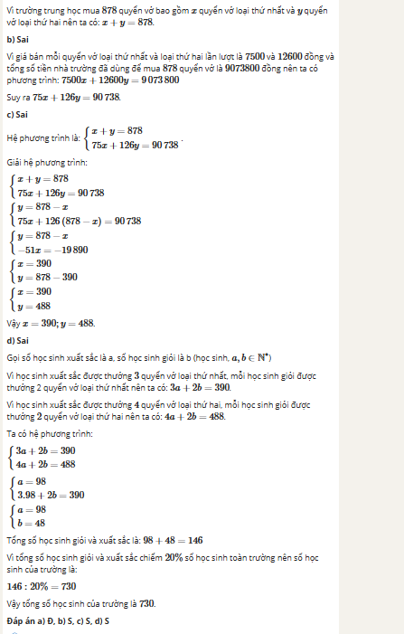 a) Đúng. Vì tổng số quyển vở là 878 nên x + y = 878.