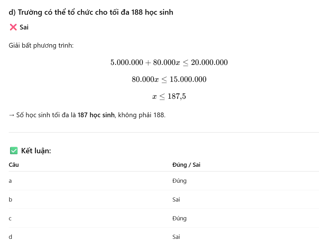 d) Trường có thể tổ chức cho tối đa 188 học sinh tham gia chuyến tham quan này. Đúng
