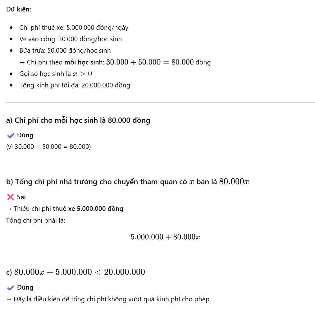 b) Tổng chi phí nhà trường cần trả cho chuyến tham quan có a bạn là 80 000x. Đúng