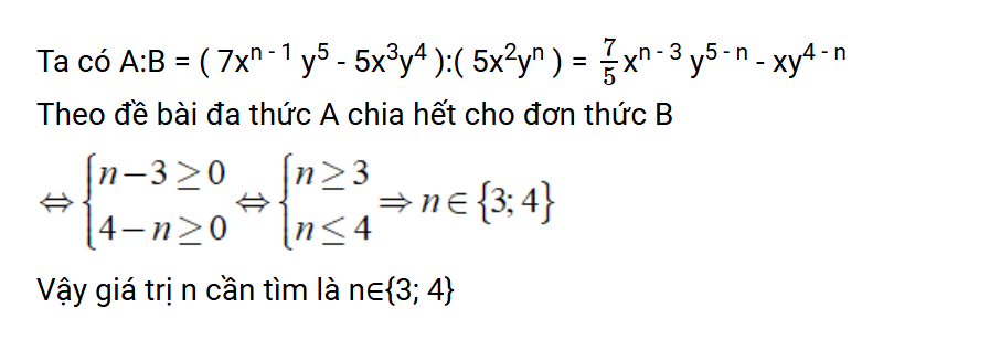 - Điều kiện để \( -7x^3y^4 \) chia hết cho \( 5x^2y^n \) là:
