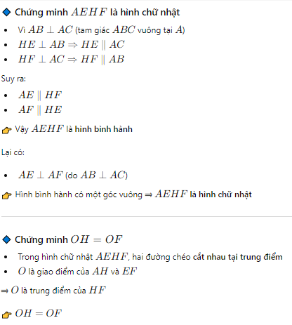 a) Chứng minh tứ giác AEHF là hình chữ nhật và \(OH = OF\).