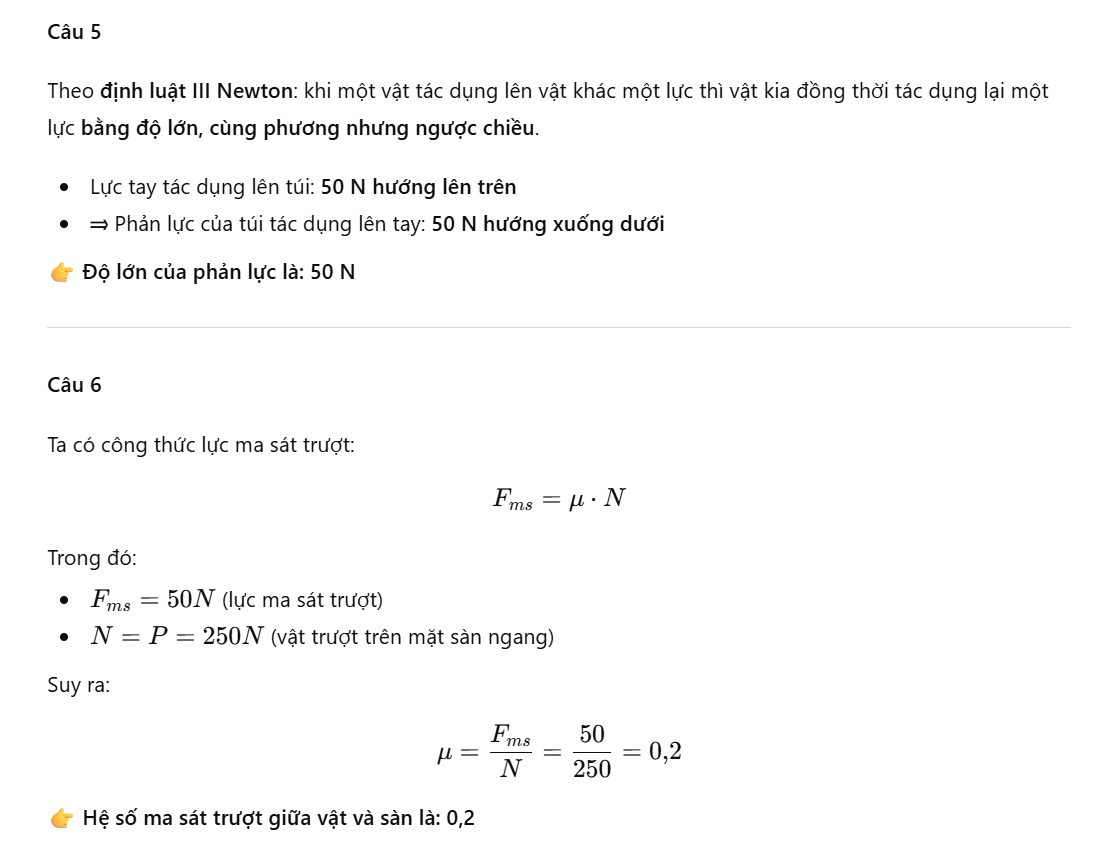 **Câu 6:** Vật nặng 250 N, lực ma sát trượt 50 N, tính hệ số ma sát trượt.
