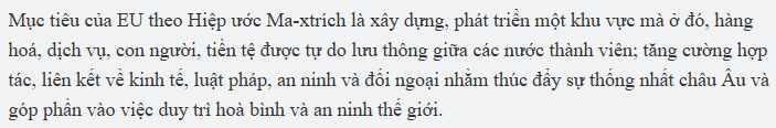 2. **Thống nhất tiền tệ (Euro)**: Nhiều nước thành viên sử dụng đồng Euro làm tiền tệ chung.