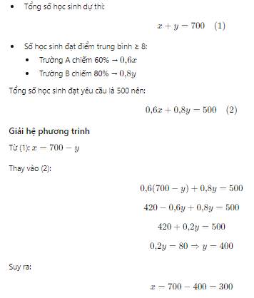 Số học sinh đạt điểm trung bình các môn dự thi không dưới 8 điểm của trường B là 80%(700 - x) (học sinh).