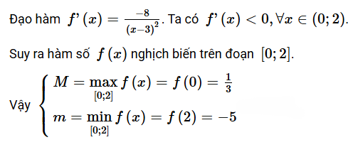 Đạo hàm \( f'(x) = \frac{-8}{(x - 3)^2} \) luôn âm trên đoạn \([0; 2]\) vì \( (x - 3)^2 > 0 \) và \(-8\) là số âm.