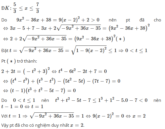 Bài 1: $\sqrt{3x-5}+\sqrt{7-3x}=9x^2-36x+38$