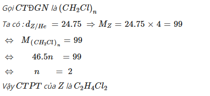 - Tính toán sẽ cho ra được công thức phân tử của Z là $C_2H_4Cl_2$.