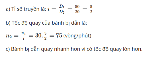 b) Tốc độ quay \( n_2 = \frac{n_1}{i} = \frac{1200}{3} = 400 \) vòng/phút.