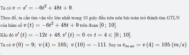 Để tìm vận tốc lớn nhất của vật trong khoảng thời gian 10 giây, chúng ta cần tìm đạo hàm của quãng đường \( s \) theo thời gian \( t \), tức là vận tốc \( v(t) \).