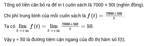 Khi đó, \(\lim_{t \to +\infty} f(t)=\lim_{t \to +\infty} \frac{10000+70t}{t}=70\) (nghìn đồng)