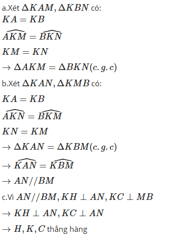 c) Kẻ \(KH \bot AN (H \in AN), KC \bot MB (C \in MB)\). Chứng minh: ba điểm \(H, K, C\) thẳng hàng.