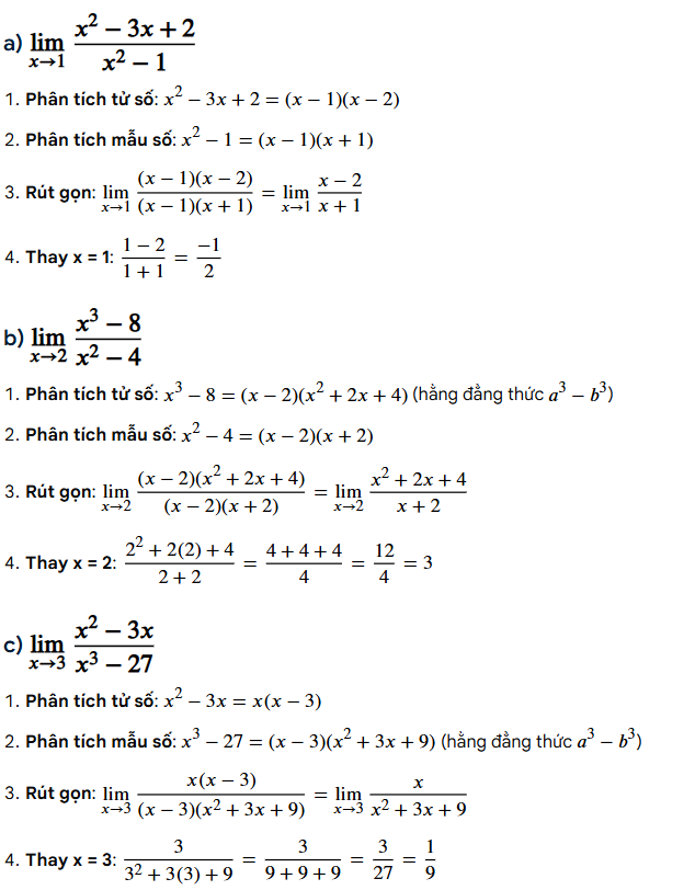 $\lim_{x\rightarrow3}\frac{x^2-3x}{x^3-27}=\lim_{x\rightarrow3}\frac{x(x-3)}{(x-3)(x^2+3x+9)}=\lim_{x\rightarrow3}\frac{x}{x^2+3x+9}=\frac{1}{7}$