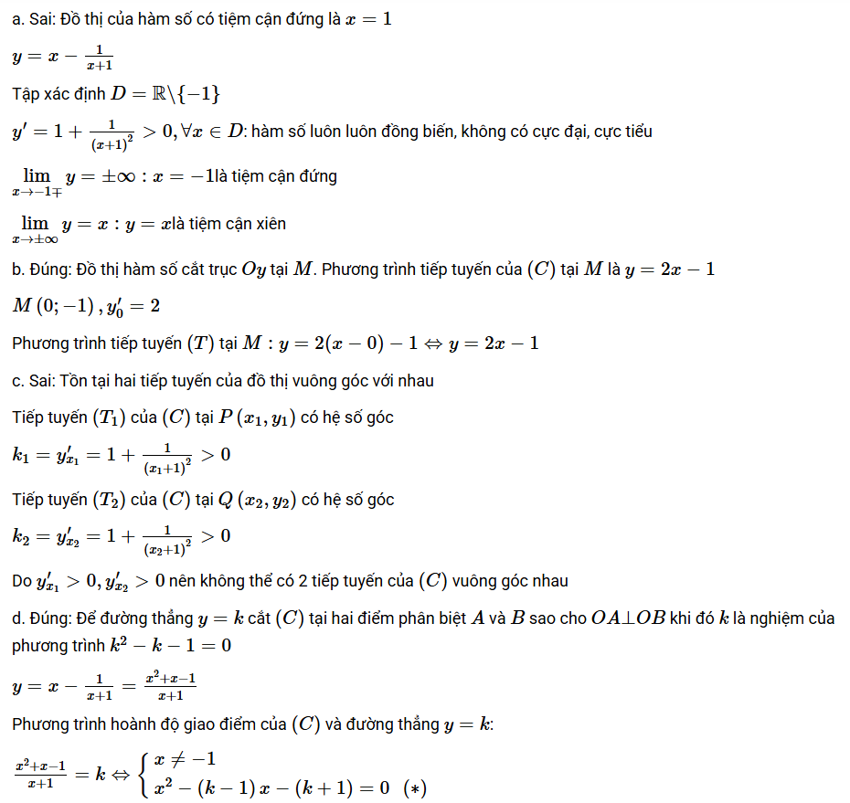 Tại \( x = -1 \), hàm số xác định và \( y = 0 \). Do đó, đồ thị cắt trục hoành tại điểm có hoành độ \( x = -1 \). Vậy khẳng định b) là đúng.