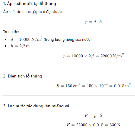 Để giữ được miếng vá từ phía trong, ta cần tác dụng một lực F có độ lớn ít nhất bằng áp lực của nước đẩy vào lỗ thủng. Công thức tính áp lực là: