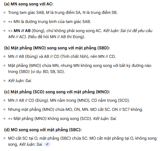 - Do đó, không có cơ sở để khẳng định mặt phẳng (MNO) song song với mặt phẳng (SBD). Mệnh đề (b) là Sai.