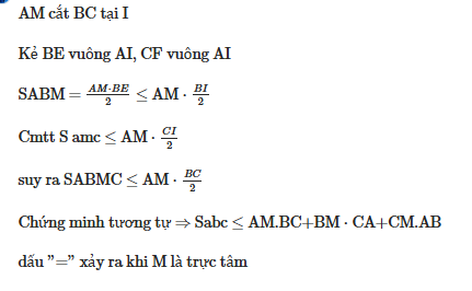 Điểm Fermat của một tam giác là điểm mà tổng khoảng cách từ nó đến ba đỉnh của tam giác là nhỏ nhất. Tuy nhiên, trong bài toán này, chúng ta cần tìm vị trí của điểm \( M \) sao cho tổng các tích \( AM \cdot BC + BM \cdot CA + CM \cdot AB \) là nhỏ nhất.