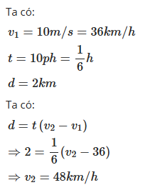 Thay số: $v_1 = \dfrac{2 + \dfrac{1}{6}.36}{\dfrac{1}{6}} = 48 (km/h) (tm)$