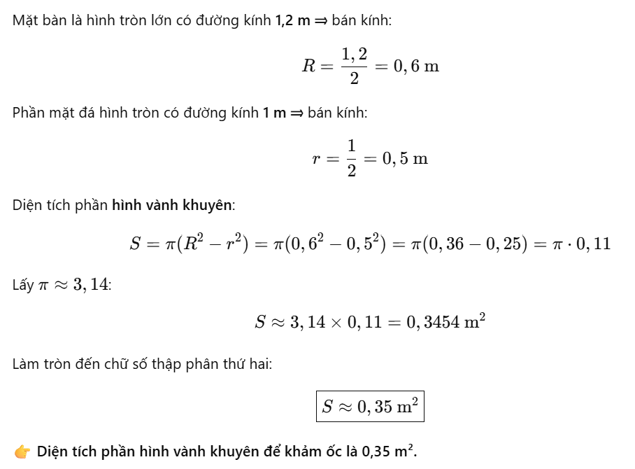 Vậy, diện tích phần hình vành khuyên để khảm ốc là \( 112.05 \text{ m}^2 \).