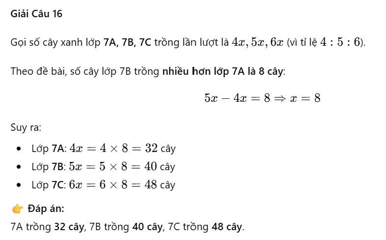 Theo đề bài, ta biết rằng số cây xanh mỗi lớp trồng lần lượt tỉ lệ với 4;5;6 và số cây lớp 7B trồng nhiều hơn số cây lớp 7A là 8 cây.