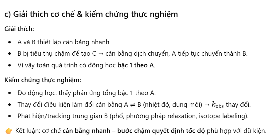 - Nếu nồng độ của B theo thời gian thể hiện bậc 1, điều này xác nhận rằng phản ứng B → C thực sự là bước chậm và xác nhận cơ chế đã đề xuất.