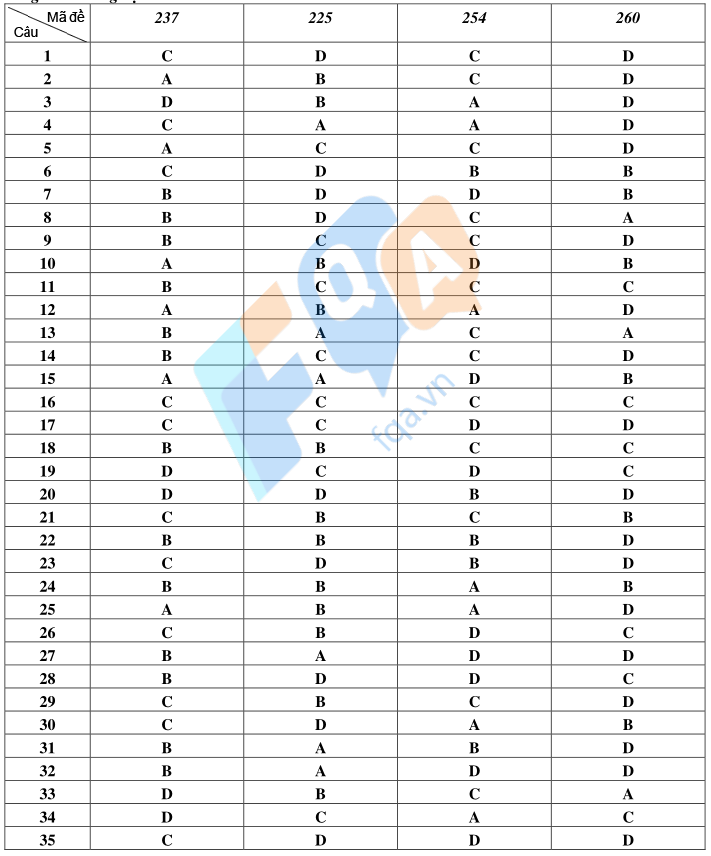 Phần đáp án câu trắc nghiệm: